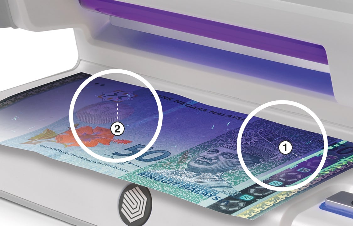 Every modern banknote contains ultraviolet (UV) ink with fluorescent phosphors that cannot be seen in daylight ①, but are clearly visible under UV light at a wavelength of 365 nanometers. UV detectors like the Safescan 40, 50 and 70 let you place a bill under a bulb emitting UV light at the correct wavelength and visually verify that it contains UV marks ②. Higher-end detectors such as the Safescan 2600 series automatically identify the UV features in modern banknotes using sophisticated UV and photonics sensors.