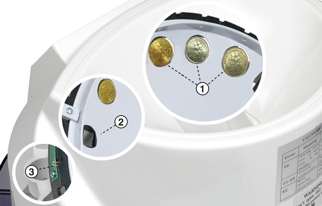 In any given currency, each coin type has its own unique diameter and thickness ➀. Mixed-coin counters like the Safescan 1250 use automated sensors and rotating discs ➁, ➂ to accurately separate coins based on these parameters and funnel them into different receiving cups.