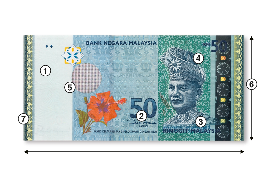 All counterfeit detectors rely on sophisticated security features that central banks deliberately insert into banknotes. These features begin with special treasury paper, which is either a cotton-linen blend or, increasingly, polymer-based. Central banks then design each banknote to contain complex ultraviolet ①,magnetic ② ③, infrared ④, color ⑤, and holographic features. In many currencies, each note type (or denomination) also has a unique, very specific size ⑥, thickness ⑦, and weight, to combat bill bleaching (where counterfeiters bleach a genuine low-value banknote and print a higher-value counterfeit on the same paper).