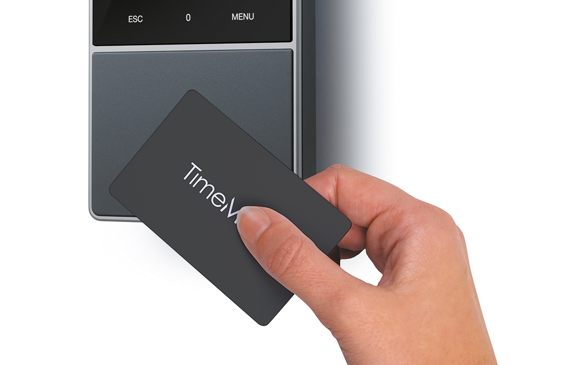 In the TimeMoto time clock systems, the RFID reader is in the terminal, and the tag is in a standard credit-card-sized badge or a small key fob. Each badge or fob is unique and identifies a specific employee. You simply hold your tag close to the terminal; you don’t even have to take it out of its holder. The reader recognizes you and registers the time, and a second later, you’re done.
