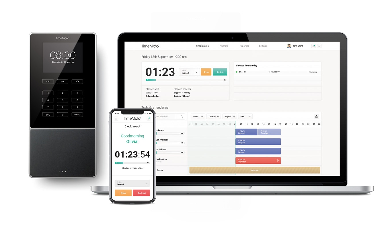 - Complete clocking solution that works perfectly with TimeMoto Cloud