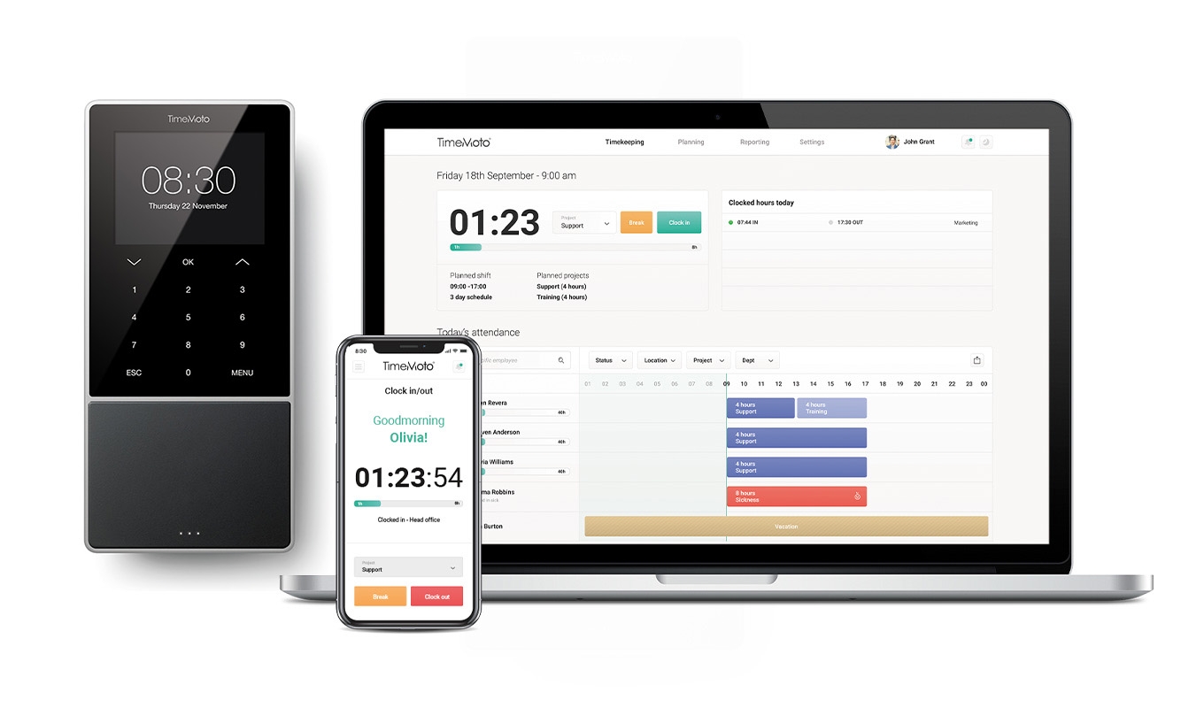 - Complete clocking solution that works perfectly with TimeMoto Cloud