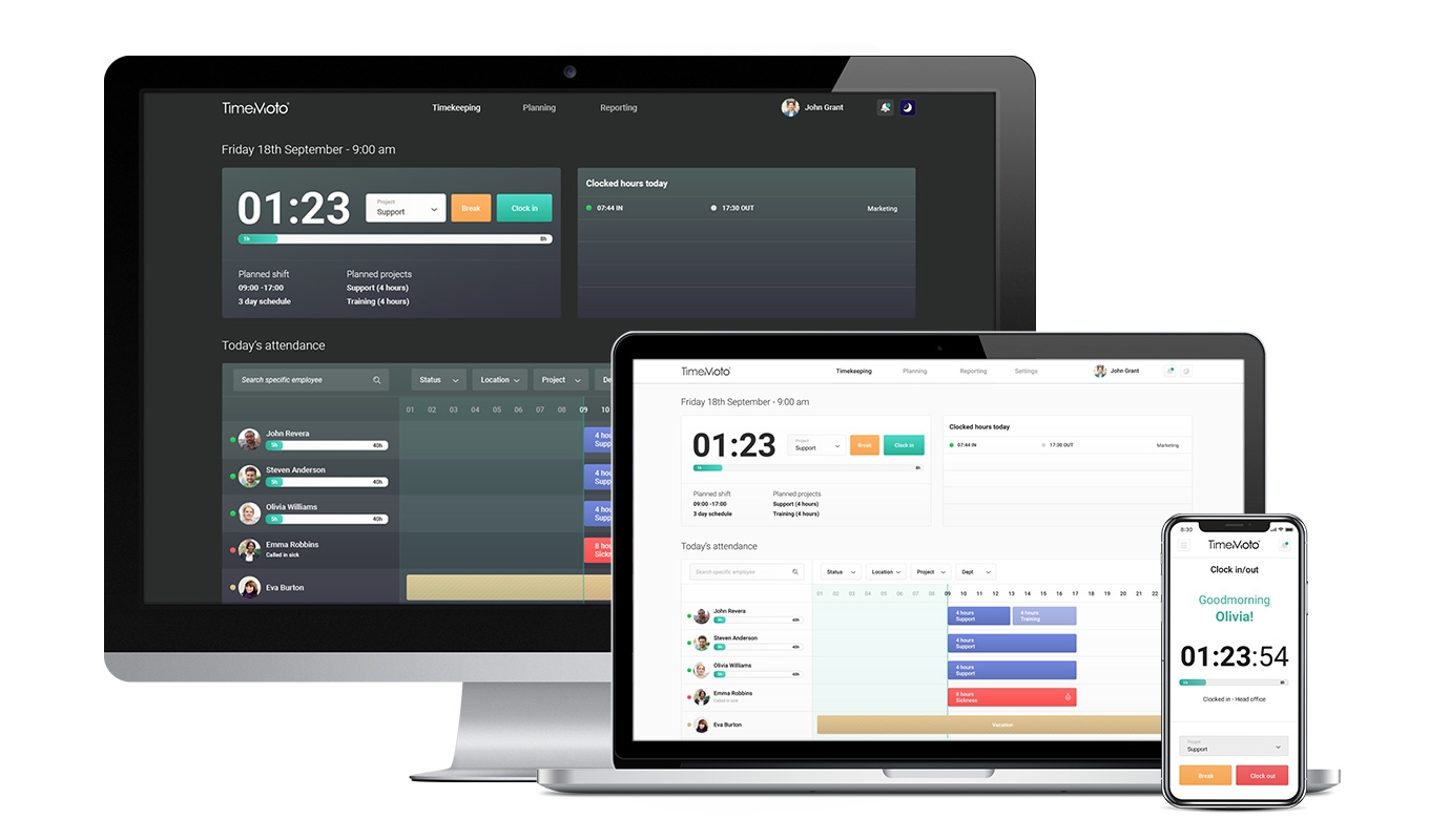 Combine your TimeMoto device with TimeMoto Cloud for optimal flexibility. Our intelligent Cloud solution provides you with complete insight and control over your time management in one easy application. With just a few easy clicks you can monitor all the clocking data from your TimeMoto device, edit and report real-time insights whenever and wherever you are. Create detailed schedules for your team and manage their overtime hours, absences, vacation requests and more.