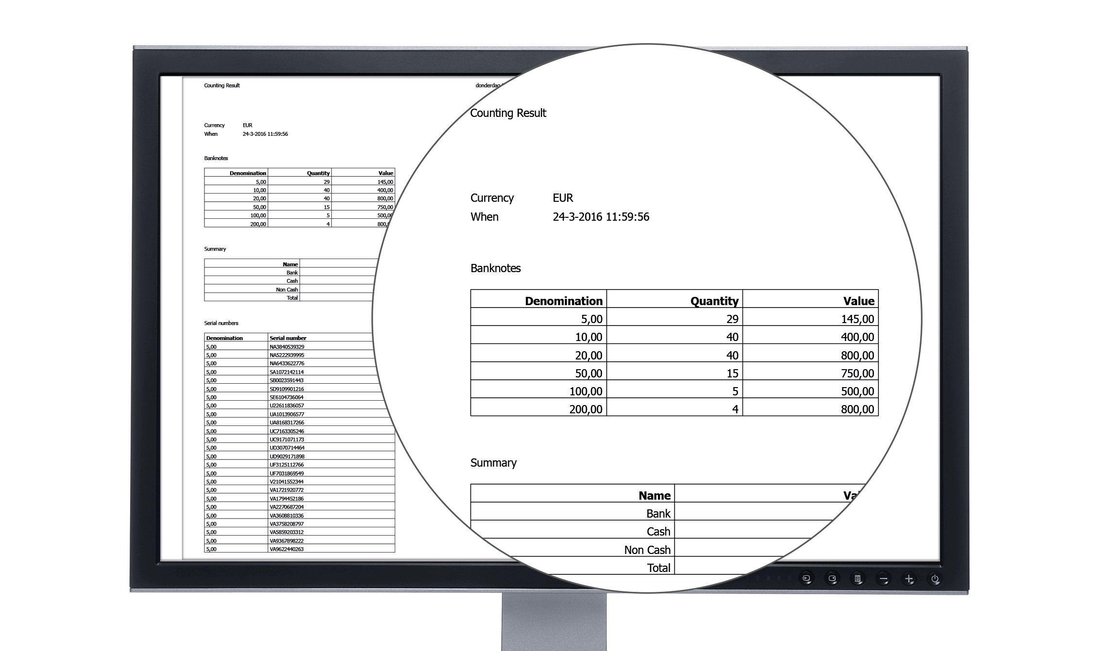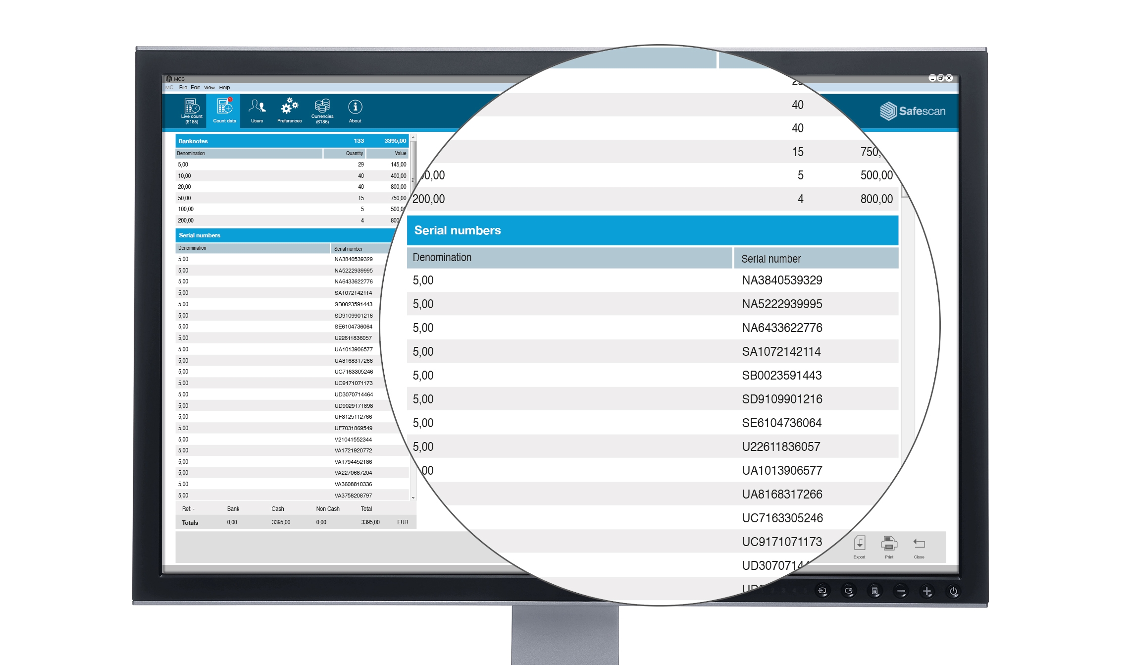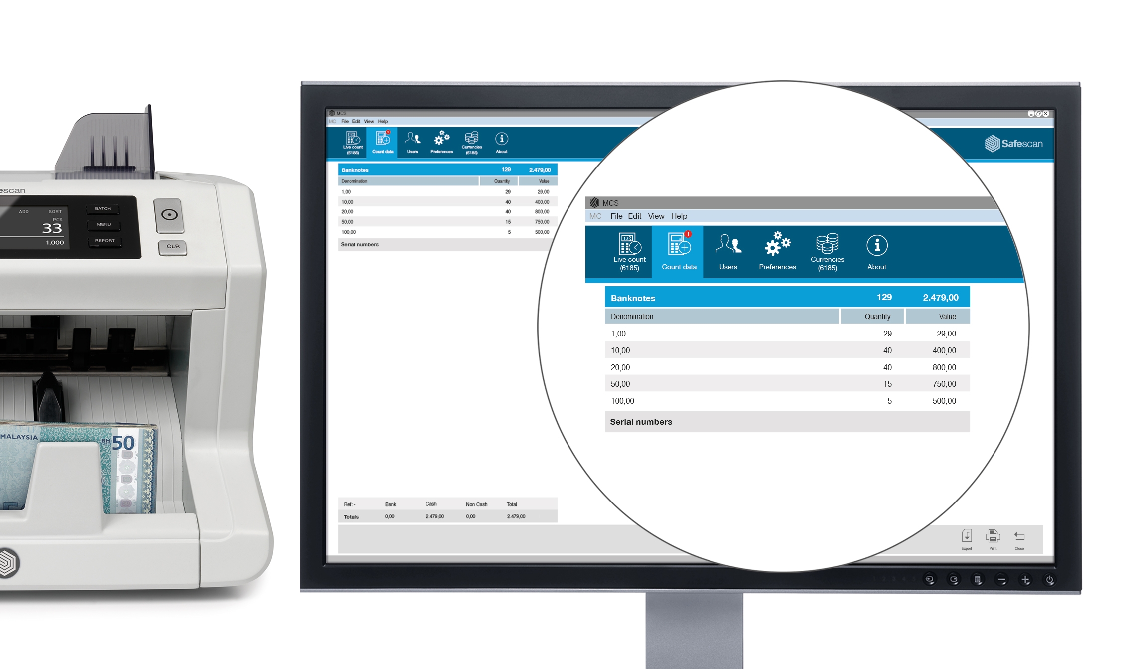 When using MCS in combination with the Safescan 2985-SX or 2995-SX, you can use the serial number scanning function of this machine in an optimal way. When sending the counting results to the software you will instantly see a specification of all serial numbers of the counted banknotes per denomination.